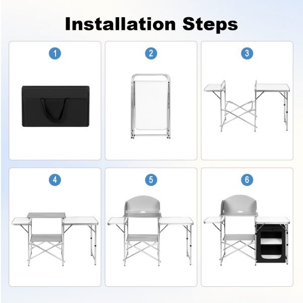 Matériau durable avec une bonne finition: avec le cadre principal en alliage d’aluminium et le dessus en MDF, la cuisine de camping WOLTU est stable, robuste et durable. Que ce soit en forêt, à la plage ou à la montagne, la table est prête à l’emploi dès l’ouverture.